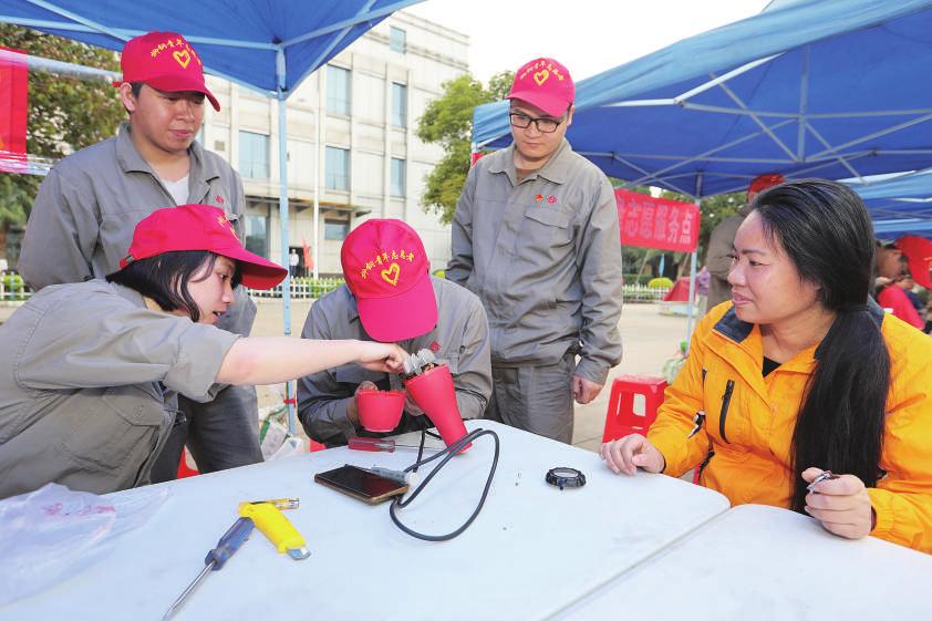 “小伙子,這個(gè)電烤箱壞了,你看能修好嗎?”“沒問題,我?guī)湍愣??!薄斑@些相片可以幫我過塑嗎?”“可以,馬上就給您過塑”……上午9時(shí)許,活動(dòng)剛剛開始,廣場上就聚集了許多群眾,面對(duì)群眾的每一個(gè)困難或疑問,志愿者都熱情解答,并一一動(dòng)手解決。